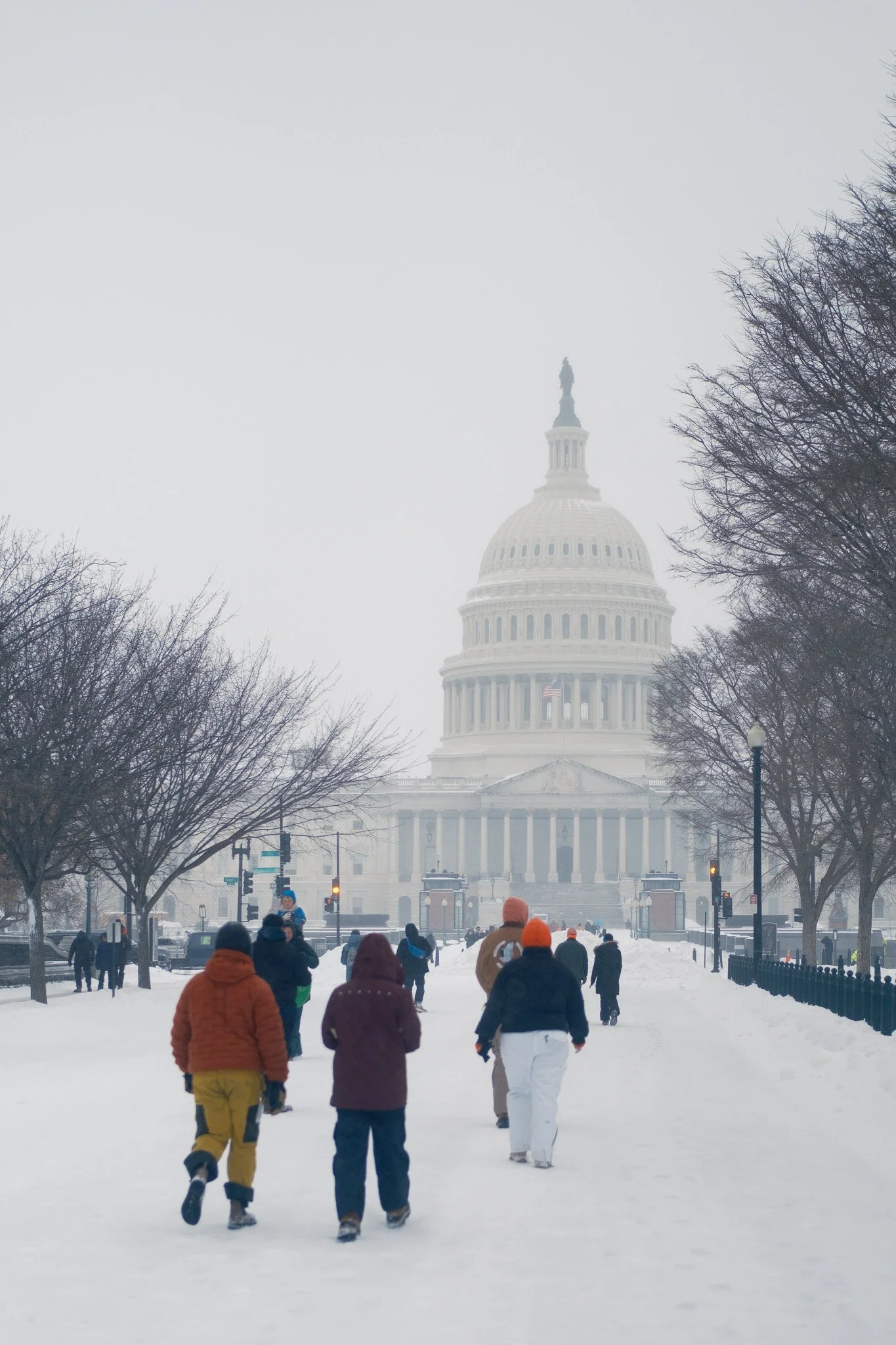 The U.S. Capitol often dominates photographs through sheer symbolic weight. In snow, it recedes. Visibility drops, contrast softens, and the building becomes less a monument than a suggestion. People walking toward it feel small, not because of power, but because of scale and atmosphere.