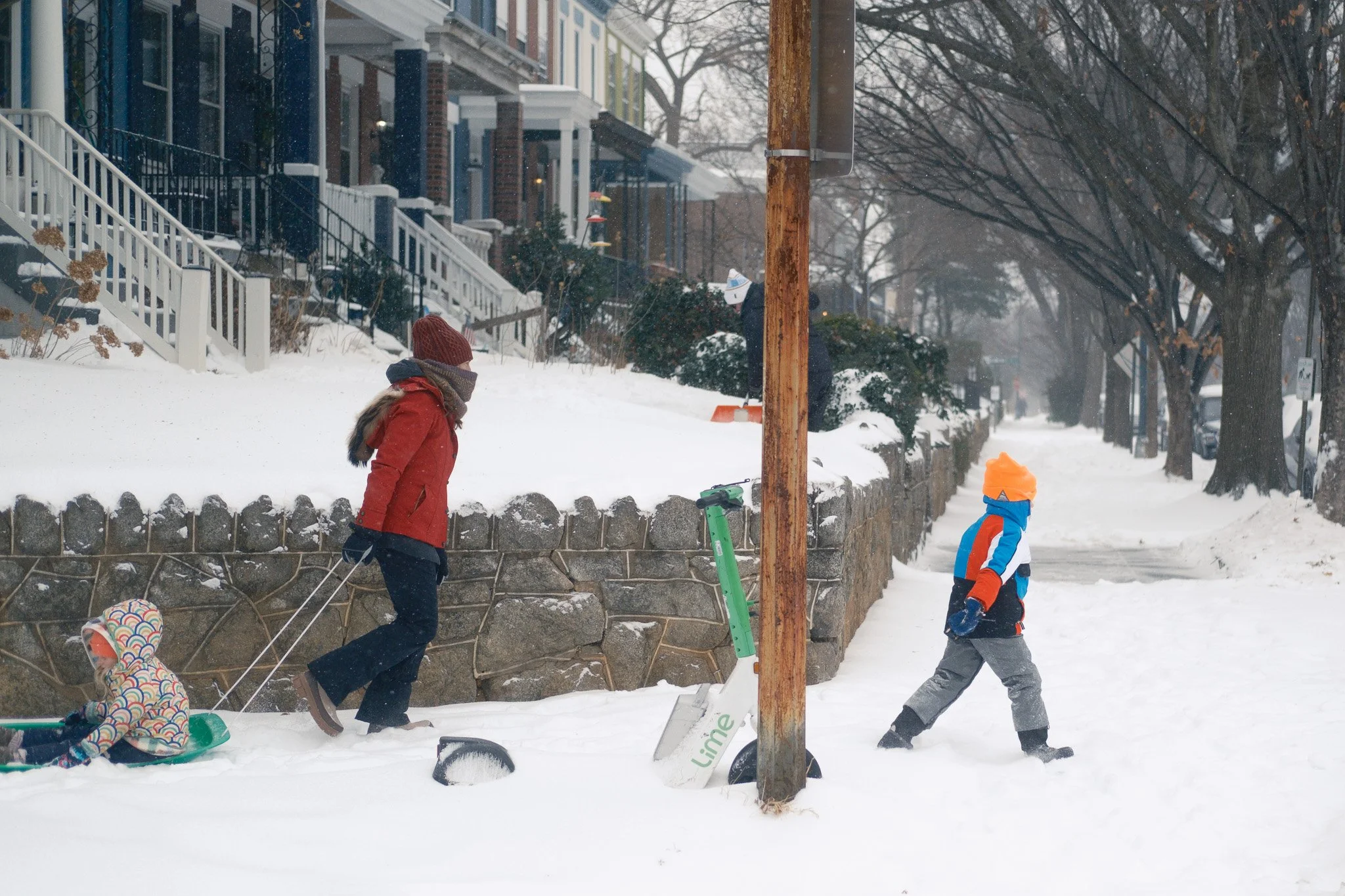Away from landmarks, snow reveals something else: adaptation. In residential neighborhoods, street photography becomes less about spectacle and more about problem-solving. Parents pulling sleds instead of strollers. Kids inventing routes where sidewalks disappear. A parked scooter half-buried, suddenly absurd.