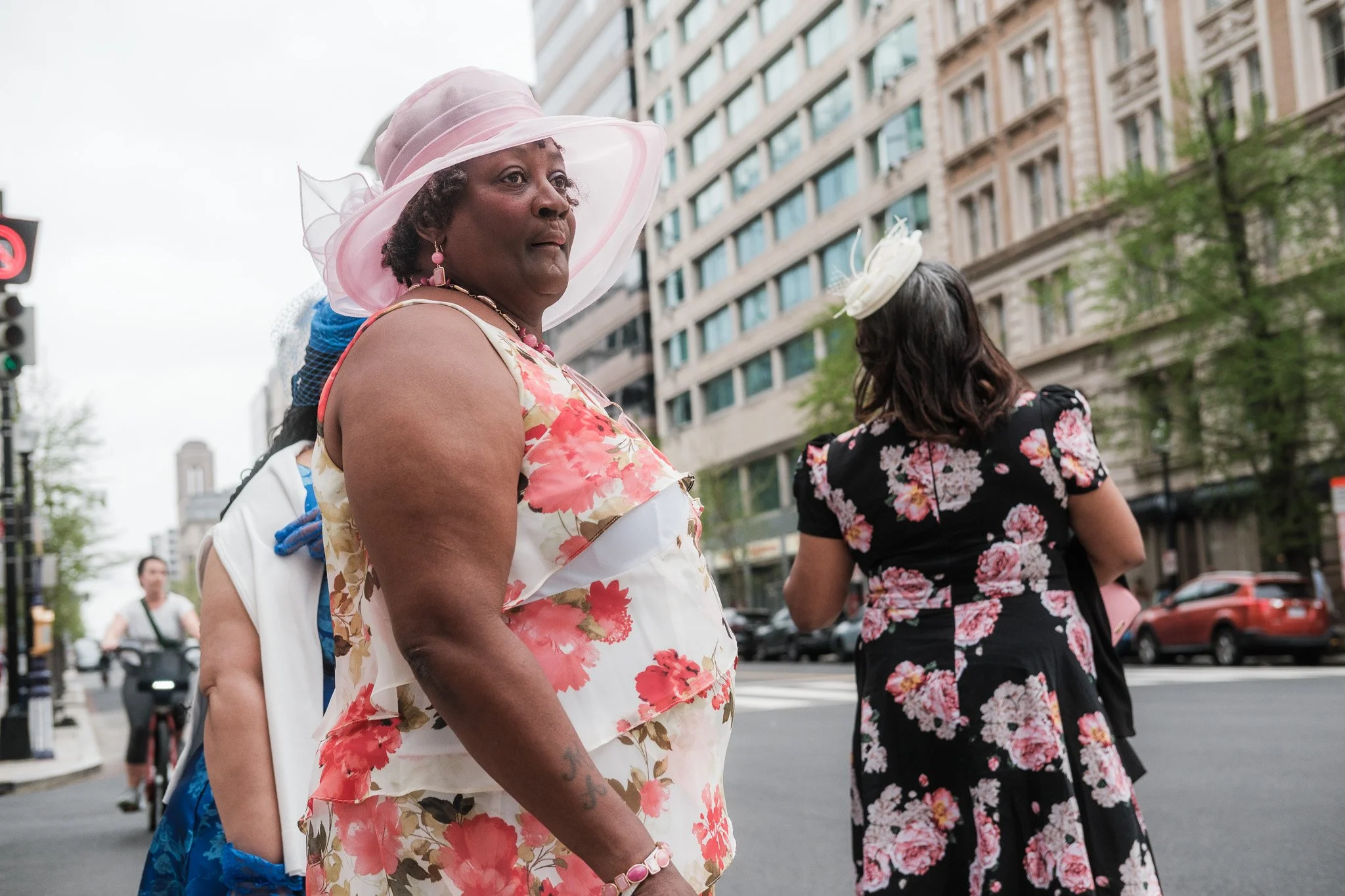 A Woman in A Floral Dress and Pink Hat in Downtown DC