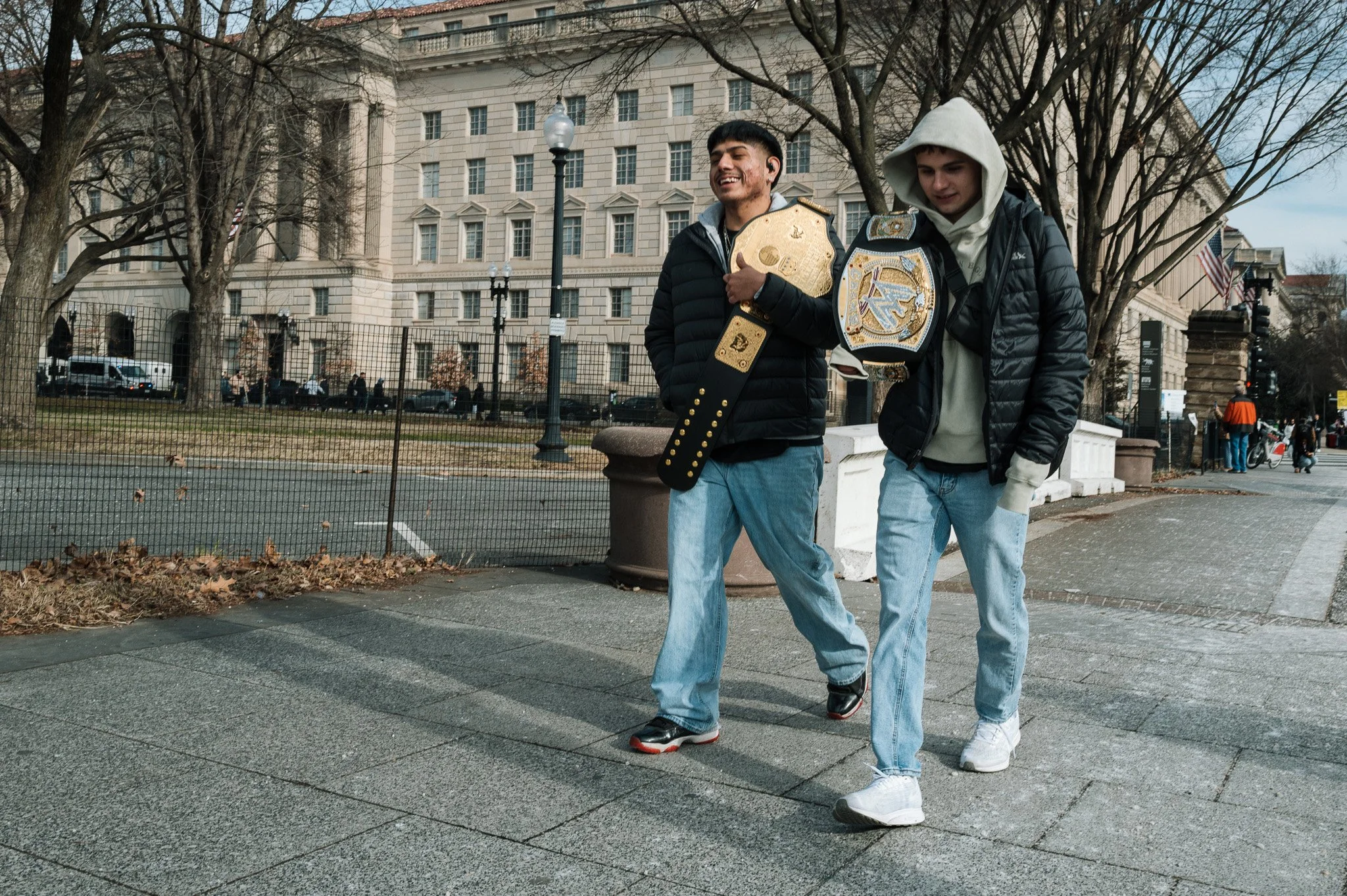 Another image leans into street photography’s love of visual contradiction. Two young men walk side by side near a government building, each carrying a championship-style wrestling belt over winter jackets and hoodies. The belts gleam absurdly against the muted tones of winter and stone.