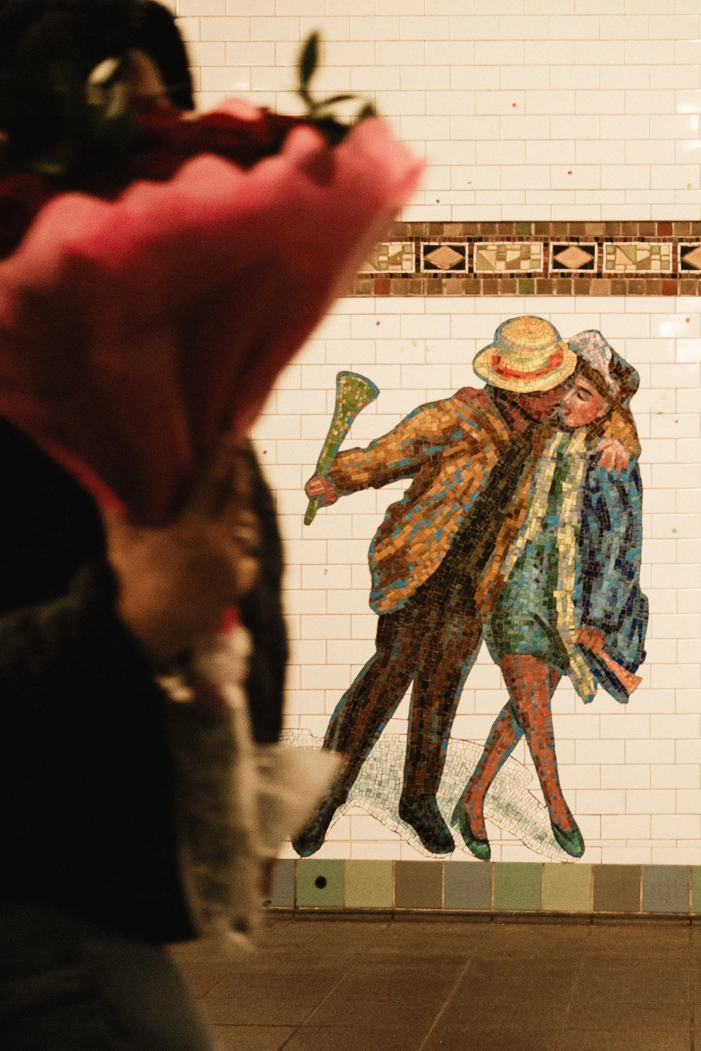 The Romantic and the Real: In the photo above, I framed a mosaic of a couple in an embrace behind a blurred foreground element. This layering adds a sense of voyeurism and depth, common in street photography, where the art on the walls seems to mimic the life of the people passing by.