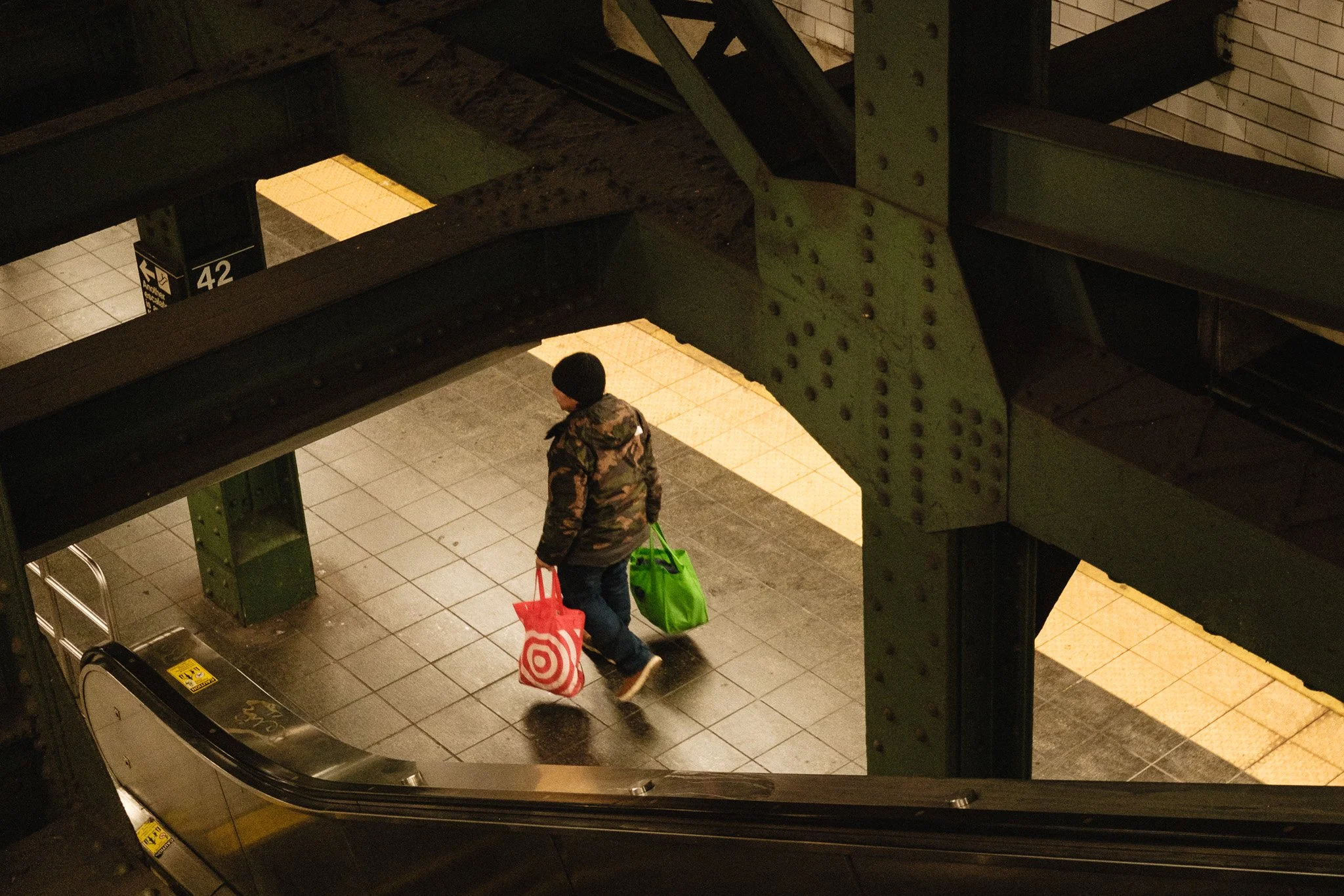 The infrastructure of the subway is a masterclass in geometry. At the Times Square-42nd St station, the massive, riveted green girders create a heavy, industrial frame for every shot. In the image above, the high-angle perspective captures the scale of this ironwork. The contrast between the rigid, dark steel and the vibrant green and red shopping bags of a lone commuter creates a pop of "urban color" that stands out against the neutral tiles.