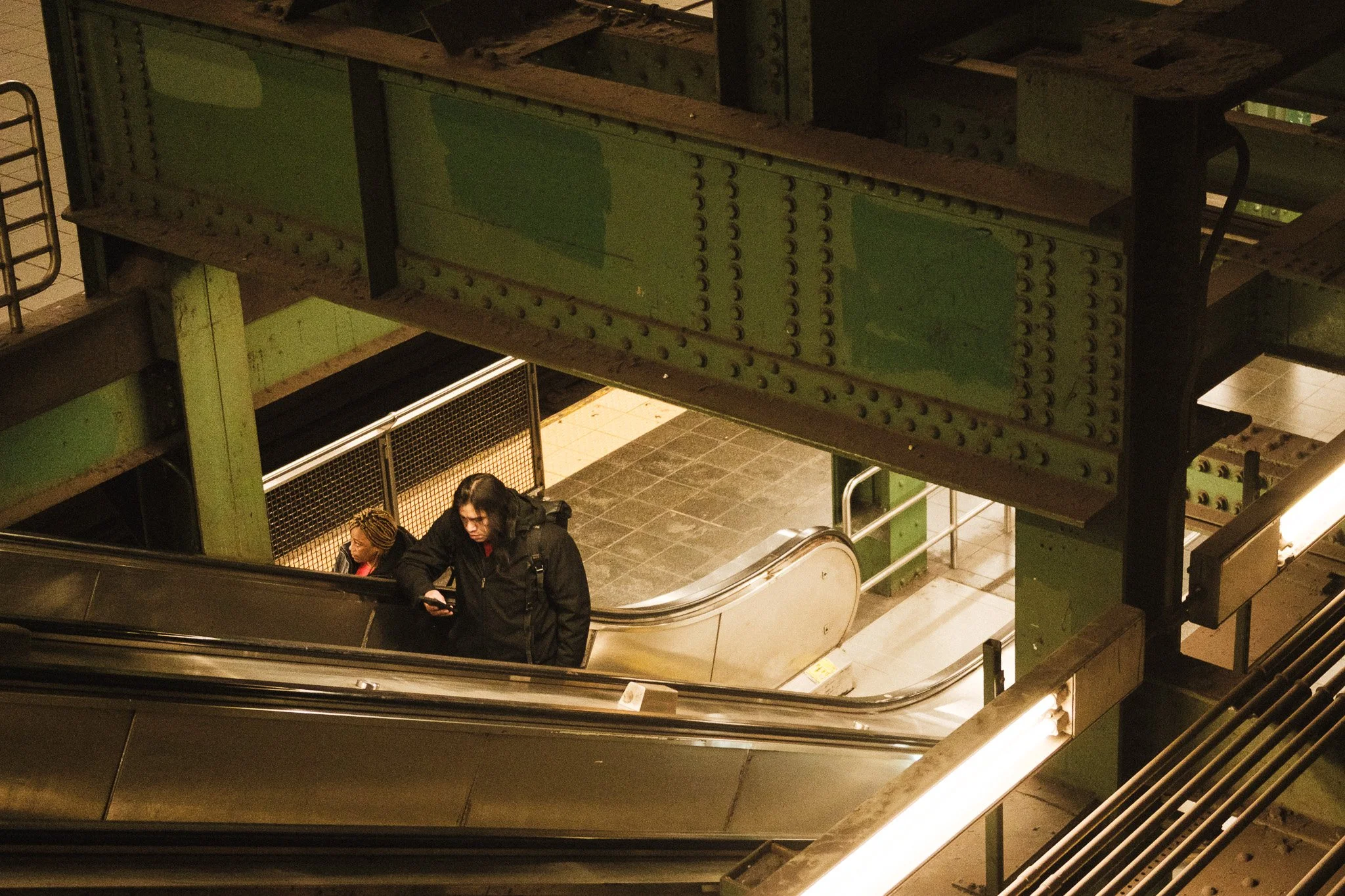 In the photo above, the man on the escalator is completely absorbed by his device, framed by the diagonal lines of the handrails and the heavy beams above. These "in-between" moments are where the most interesting narratives live. Whether it’s the quiet concentration of a commuter or a silhouette framed by a speeding train, the underground provides endless opportunities to document the human condition away from the distractions of the skyline.