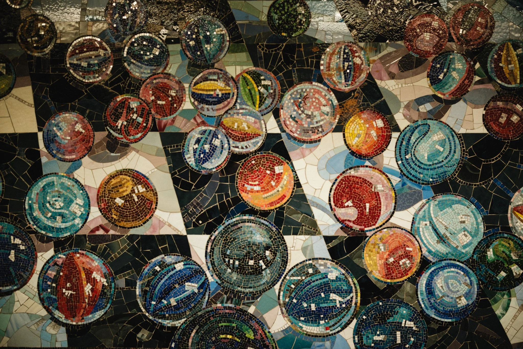 Whimsy in the Dark: The colorful glass marbles of the "Times Square Mural" offer a playful break from the grit. Capturing these details in a tight frame showcases the textures and craftsmanship that millions of people walk past every day without a second glance.