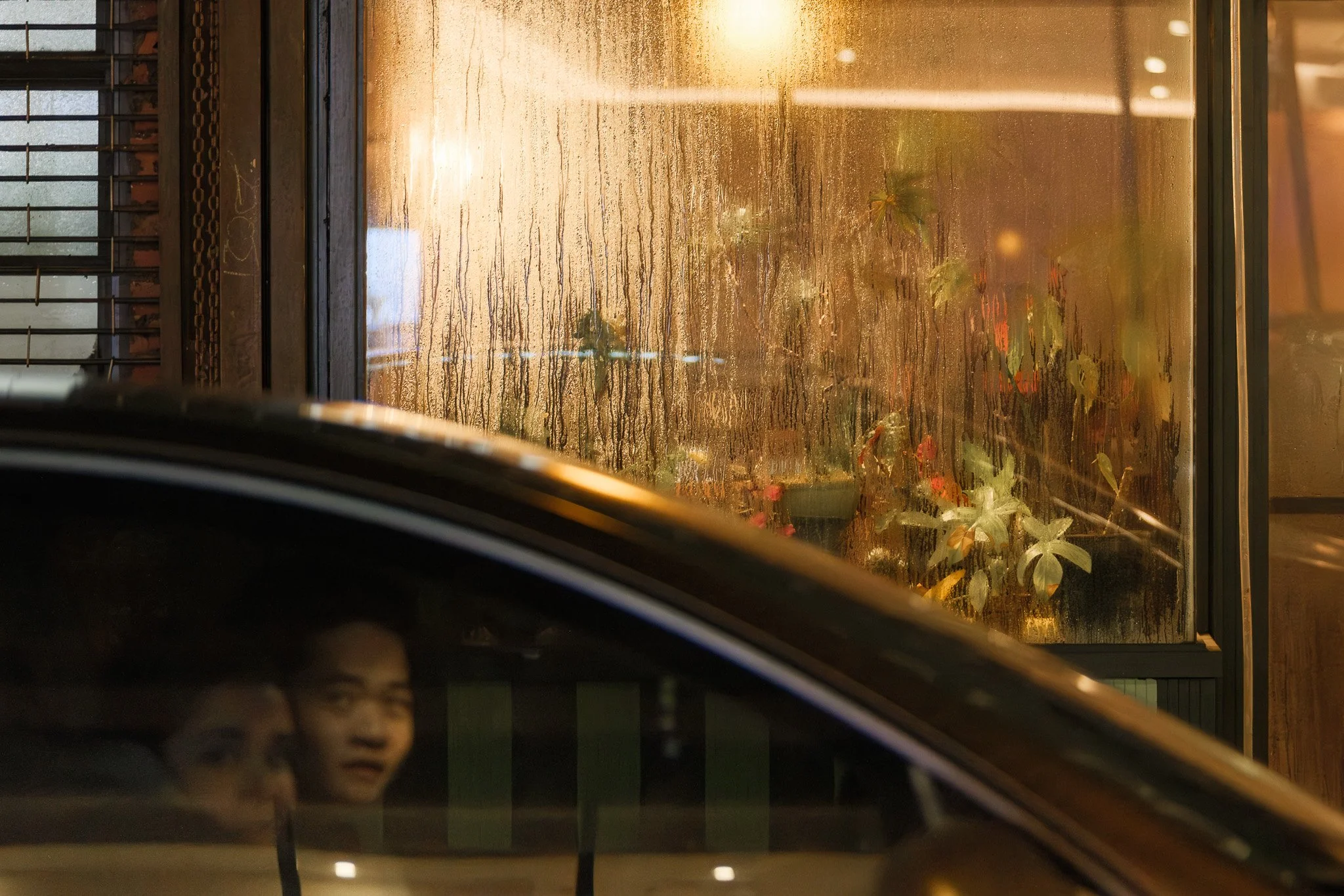 The Texture of the City: Rain and humidity are often seen as obstacles, but for candid street photography, they are gifts. The condensation on a window, as seen in the shot of the greenery behind the glass, transforms a mundane scene into something impressionistic. It obscures the literal and leaves room for the viewer's imagination.