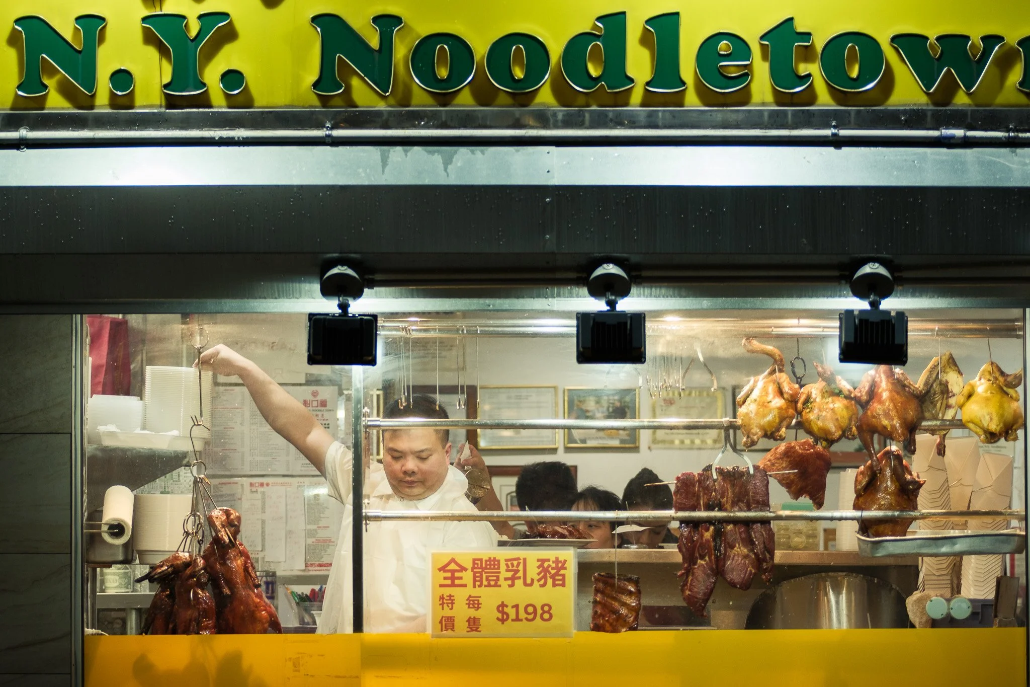 The Cinematic Glow: In a photo like the one outside N.Y. Noodletown, the yellow signage and the warm interior light against the dark street create a natural contrast. By focusing on the workers behind the glass, the image becomes about the sanctuary of the interior versus the cold of the New York night.