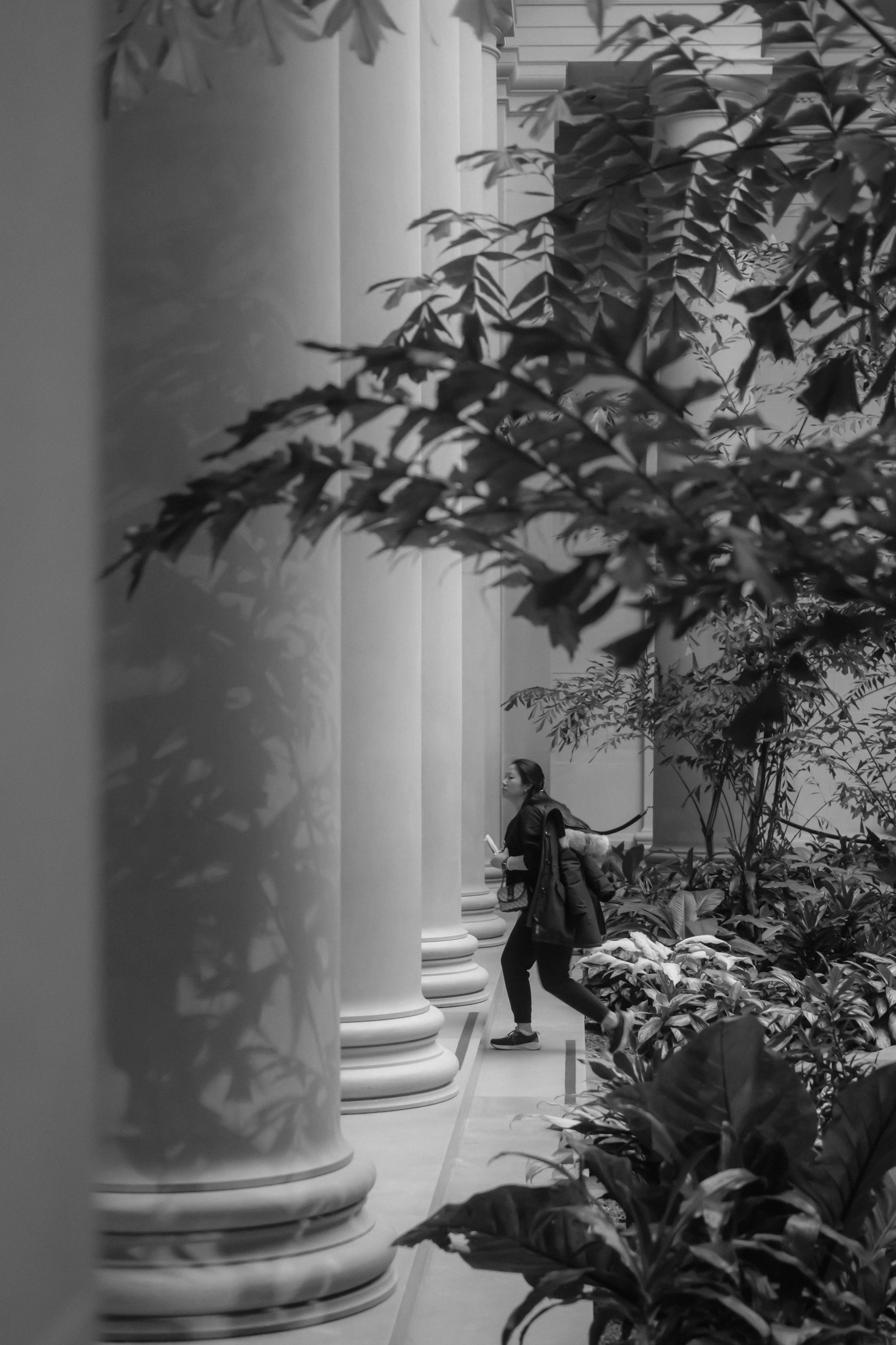 A Woman Runs Through a Leafy Atrium