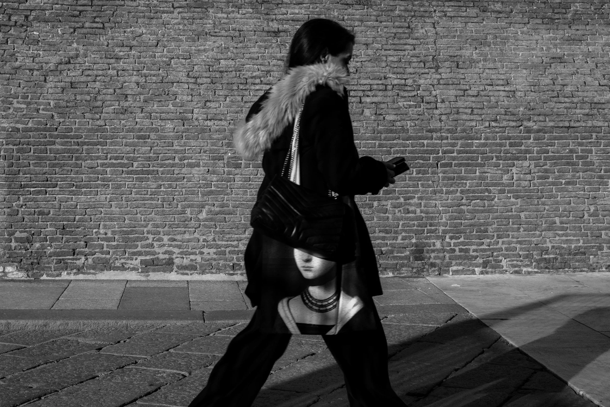 A painting on a woman’s bag is illuminated by daylight in Bologna, Italy