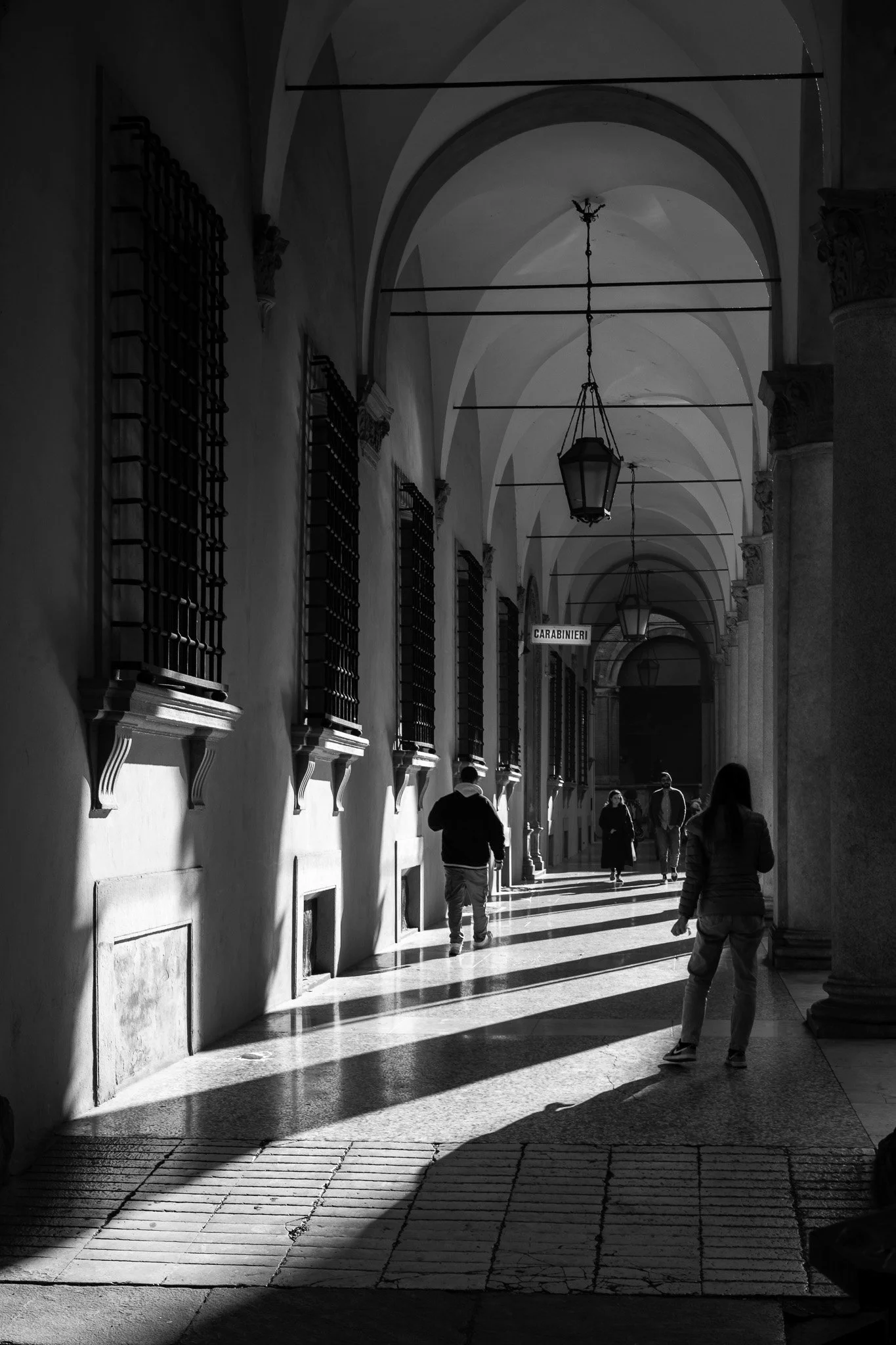 The city’s famous porticos create a unique lighting environment. The harsh contrast between the bright Italian sun and the deep shadows of the covered walkways offers perfect opportunities for dramatic black and white street photography.
