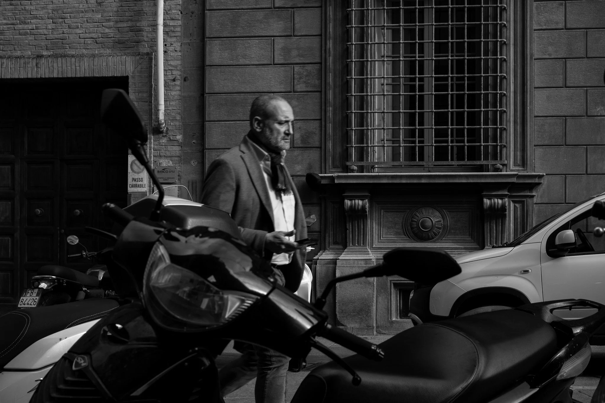 A black and white image of a dapper man walking the streets of Bologna, Italy
