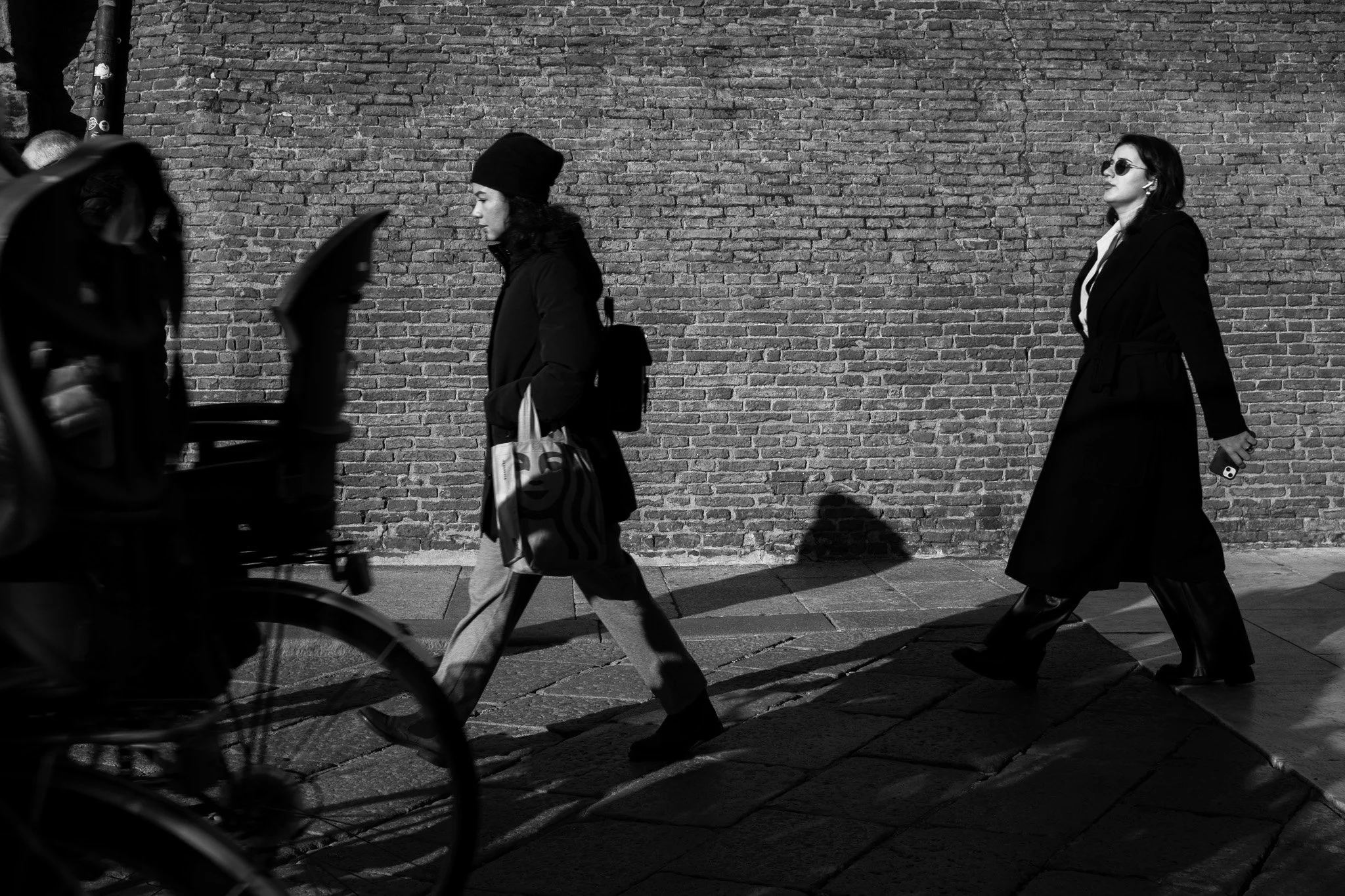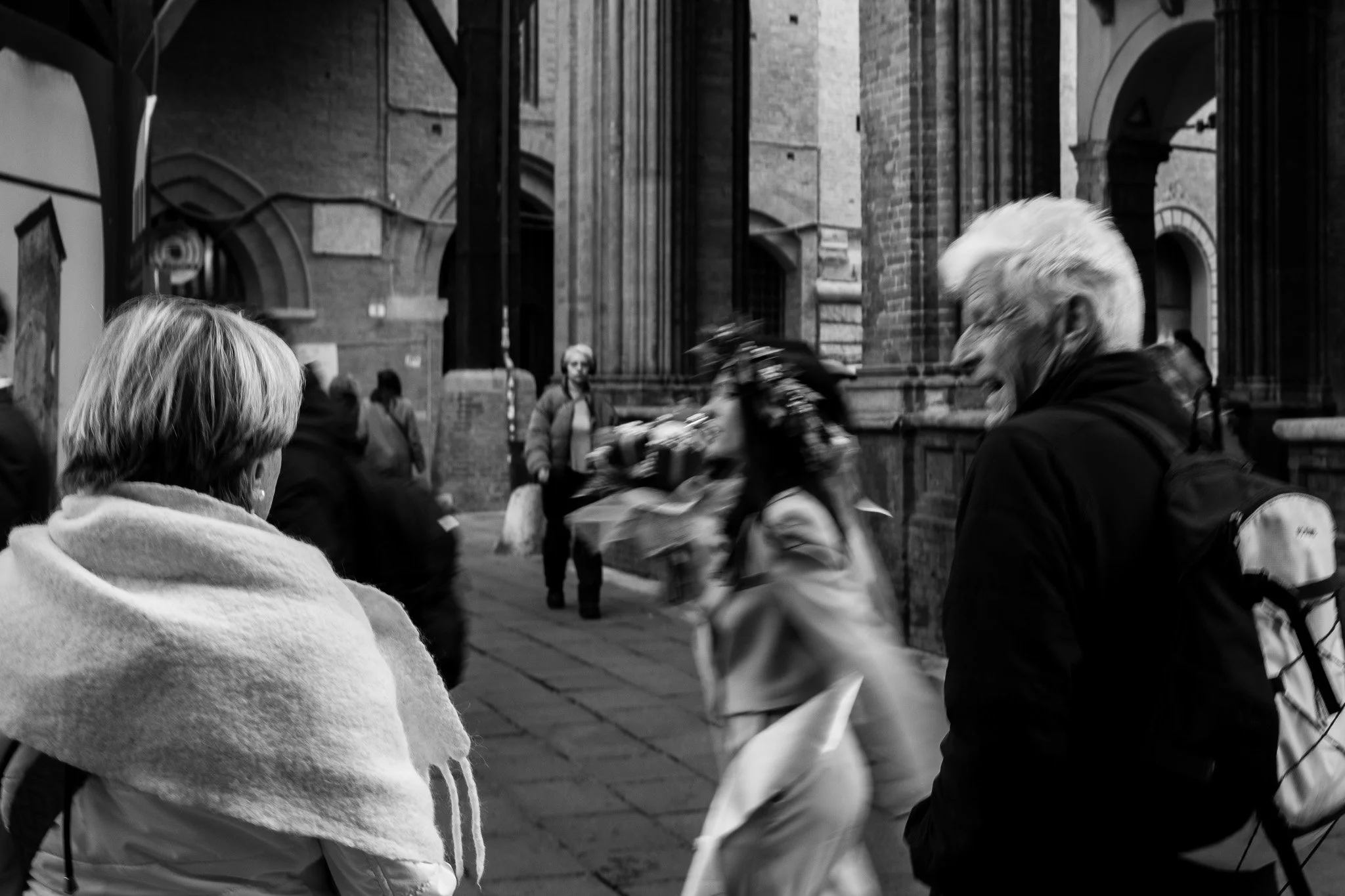 A black and white street photo of pedestrians in Bologna, Italy