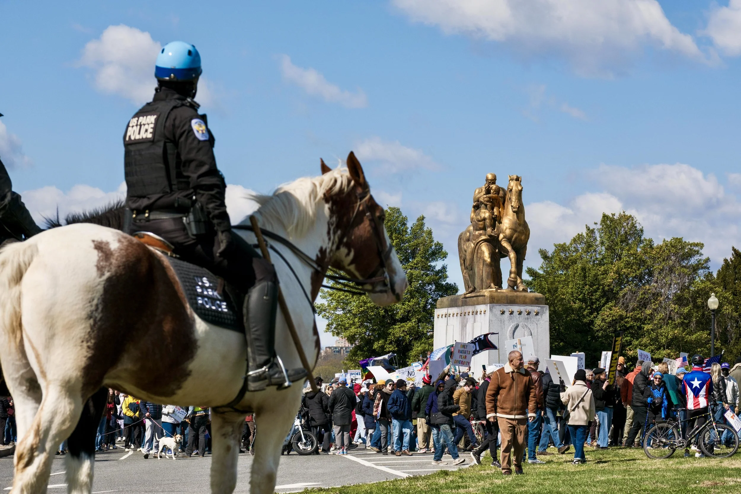 In one frame, a mounted officer enters from the left while the crowd fills the background, anchored by a statue. The image works because it captures multiple layers of authority and response in a single moment.
