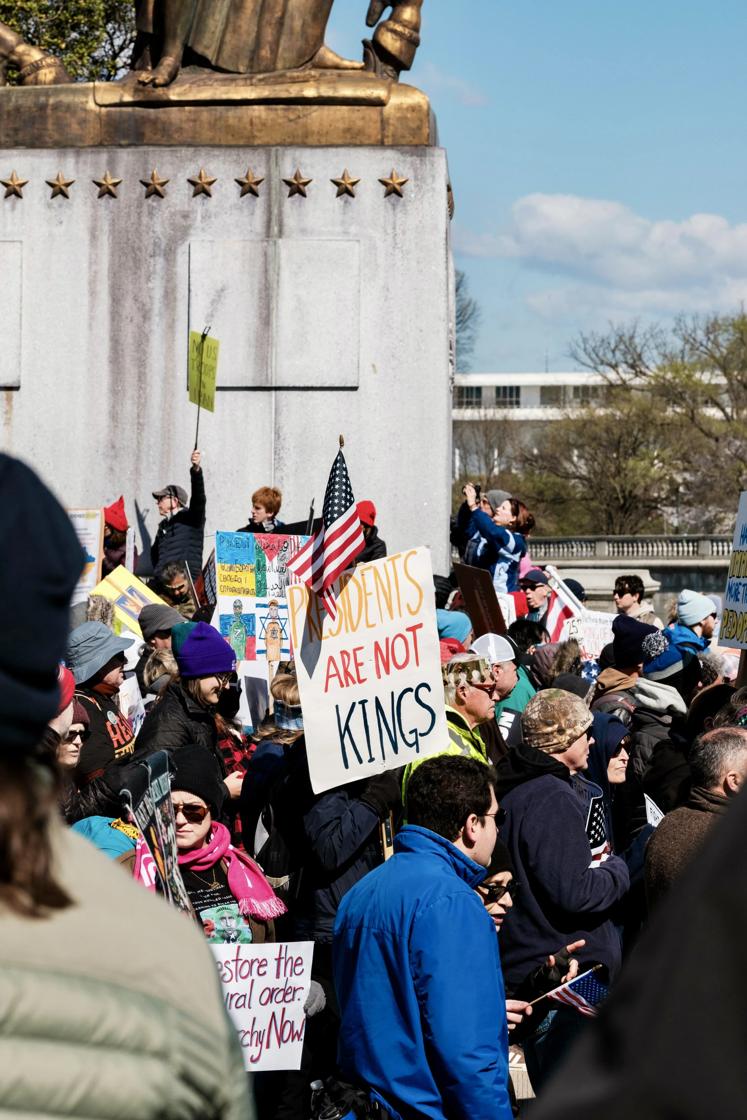 A sign reading “Presidents Are Not Kings” held beneath a statue that evokes authority